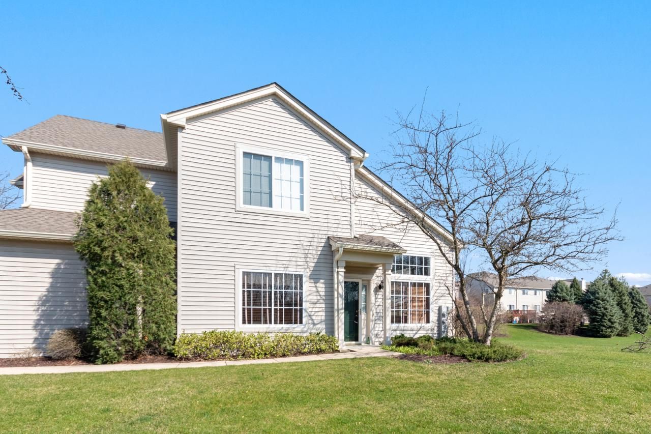 Abington Woods condo of Oakhurst Community and esteemed District 204. This is a single-level Ranch, End Unit. This light and bright 2 Bedrooms, 2 bathrooms and 2 car-garage unit looks over yards of retention with green lawns and trees. The dining room and living room lookout to wetlands for a nature view. Vaulted ceilings in the living room and 9ft ceilings throughout. Hallway bathroom was updated about 5 years ago. The spacious kitchen fits more than one chef at a time with 42 cabinets for storage and pantry closet to fit all your cuisine ingredients. The primary bedroom has a walk-in closet with ensuite bathroom which includes a soakingtub and separate shower. Additional storage in the utility room which includes a washer and dryer. Neutral carpet. Close in proximity to parks, shopping centers, restaurants, repair services and more. A must see. As Is.